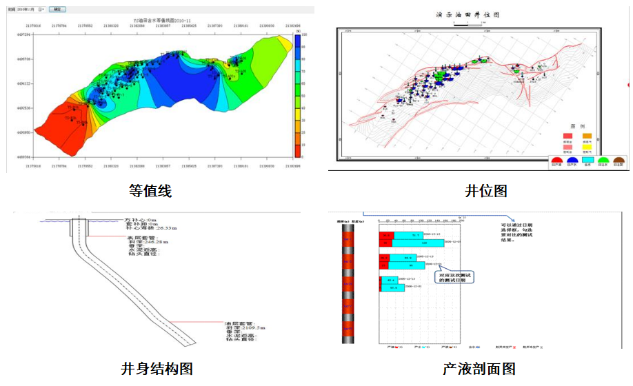 油氣藏動態(tài)分析系統包含開發(fā)現狀圖、單井柱狀圖、連井剖面圖、井身結構圖、鉆井管柱圖、開發(fā)生產類圖、統計類圖、圖版類圖等。